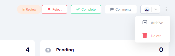 Once it progresses to the "In progress" stage or beyond, you can archive it by accessing the application and clicking the "Archive" button, located within the "..." menu displayed vertically on the right-hand side next to the Userr drop-down menu. This button is highlighted in red for easy identification.
