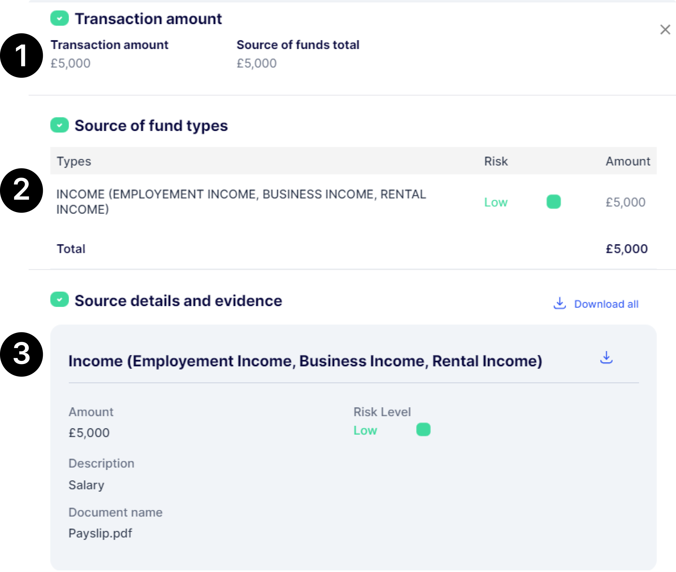 Review Status: Any source of funds type with a medium or high-risk level will be flagged for review, allowing you to investigate further based on your business risk appetite.
