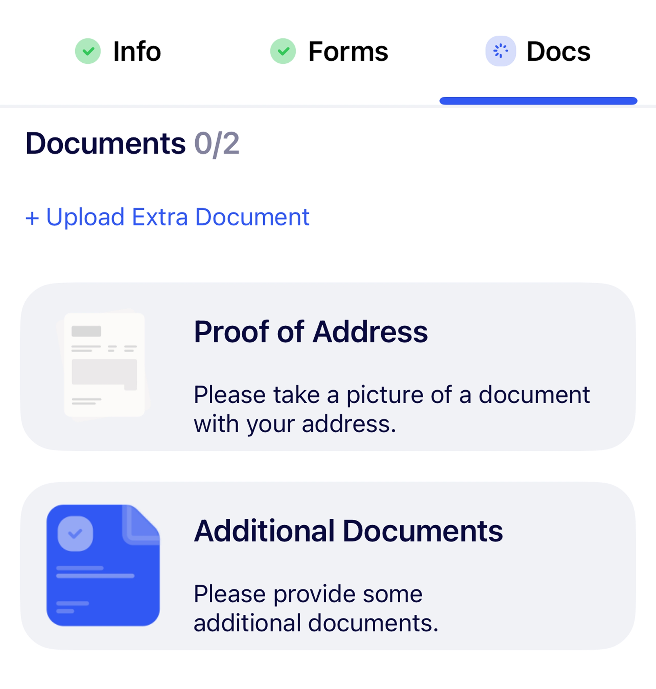 Mobile users can access the "Documents" section by clicking on the Docs tab in the app. Here, they can view the list of requested additional documents and Proof of Address documents that you have asked them to provide. They also have the option to upload Extra Documents if they wish to submit additional information.