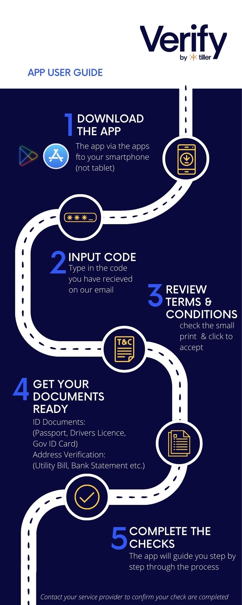 The Verify Mobile App is downloaded by customers to provide information and complete their checks. It has been designed to make the verification process quick and easy for customers, eliminating the need for manual processes. Following a few simple steps, customers can complete their verification process in less than 10 minutes. For more detailed information, please visit the following link: